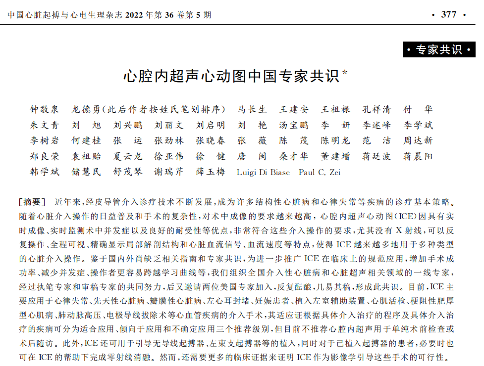 鑒于目前國(guó)際上缺乏相關(guān)指南,為促進(jìn)和規(guī)范ICE的臨床應(yīng)用,為臨床醫(yī)生提供指導(dǎo),進(jìn)一步完善心血管介入診斷和治療方案,2022年10月,由國(guó)內(nèi)外數(shù)十位頂尖專家學(xué)者編寫(xiě)完成全球首個(gè)心腔內(nèi)超聲專家共識(shí),聯(lián)合在Frontiers in Cardiovascular Medicine上發(fā)表,推動(dòng)了心腔內(nèi)超聲心血管介入領(lǐng)域的的規(guī)范化應(yīng)用。