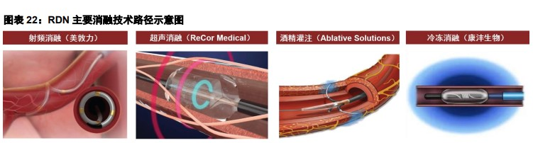 腎交感神經(jīng)過(guò)度興奮可使血壓上升,高血壓死亡風(fēng)險(xiǎn)高、治療負(fù)擔(dān)重,盡管已上市降壓藥物眾多,但仍存在大量藥物依從性差及耐藥患者。經(jīng)腎動(dòng)脈去交感神經(jīng)術(shù)(RDN)是指通過(guò)介入治療方法(經(jīng)股動(dòng)脈、橈動(dòng)脈),破壞腎交感傳入和傳出神經(jīng),減弱腎和全身交感神經(jīng)活動(dòng),從而降低血壓,實(shí)現(xiàn)一次微創(chuàng)手術(shù)長(zhǎng)期平穩(wěn)降壓。RDN技術(shù)已經(jīng)歷10余年發(fā)展,可基于射頻消融、超聲消融、冷凍消融、化學(xué)消融等方式,其中主要以射頻消融(rRDN)和超聲消融(uRDN)為主導(dǎo)。