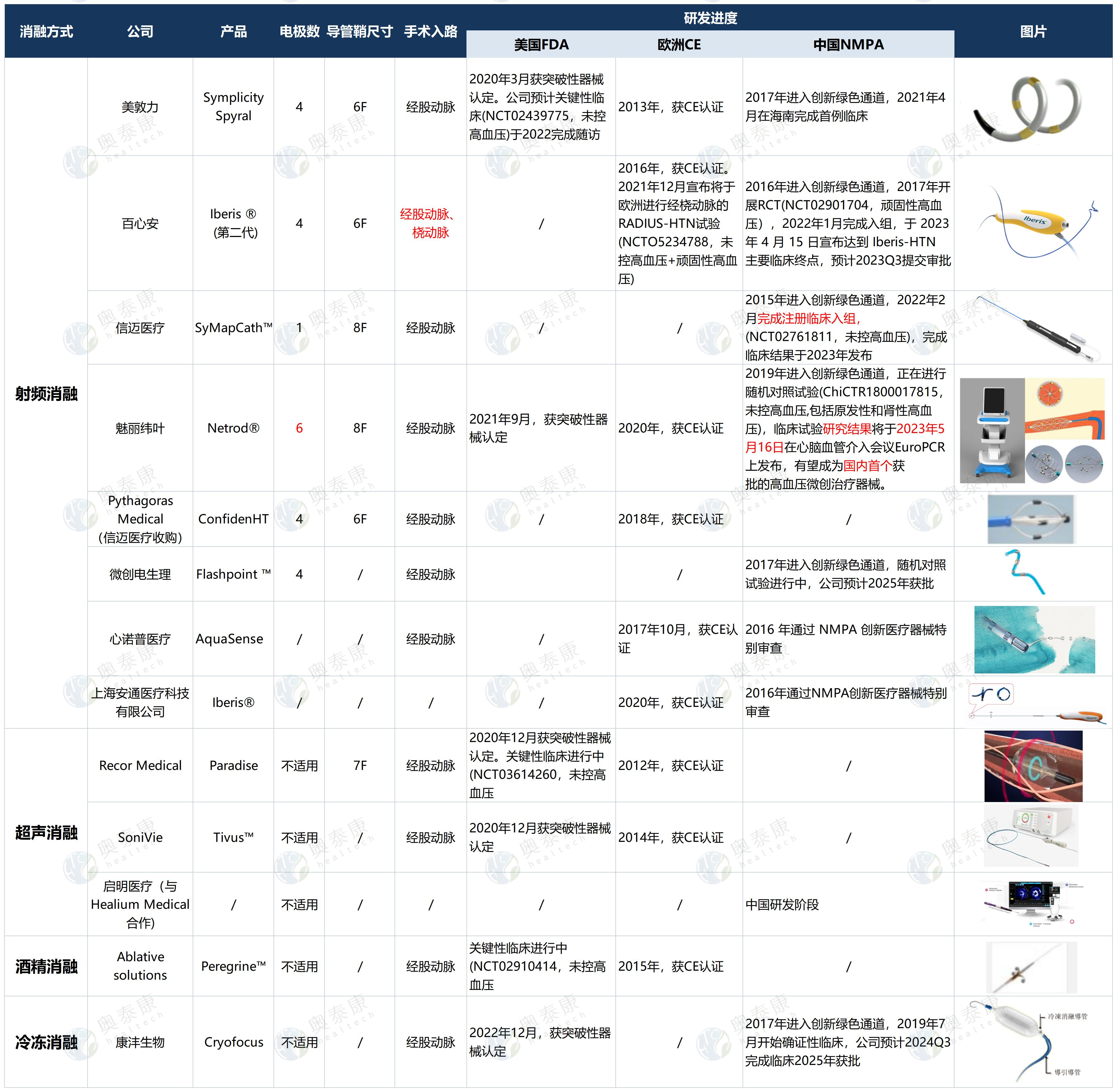 當(dāng)前,已有8家公司的RDN產(chǎn)品進(jìn)入NMPA創(chuàng)新器械特別審批綠色通道,5個(gè)產(chǎn)品獲得美國(guó)FDA突破性器械認(rèn)定,國(guó)外廠家以美敦力、ReCor Medical、Sonivies、Ablative Solutions為主,國(guó)內(nèi)以百心安、魅麗緯葉、信邁醫(yī)療、康灃生物、微創(chuàng)電生理、心諾普等為主。