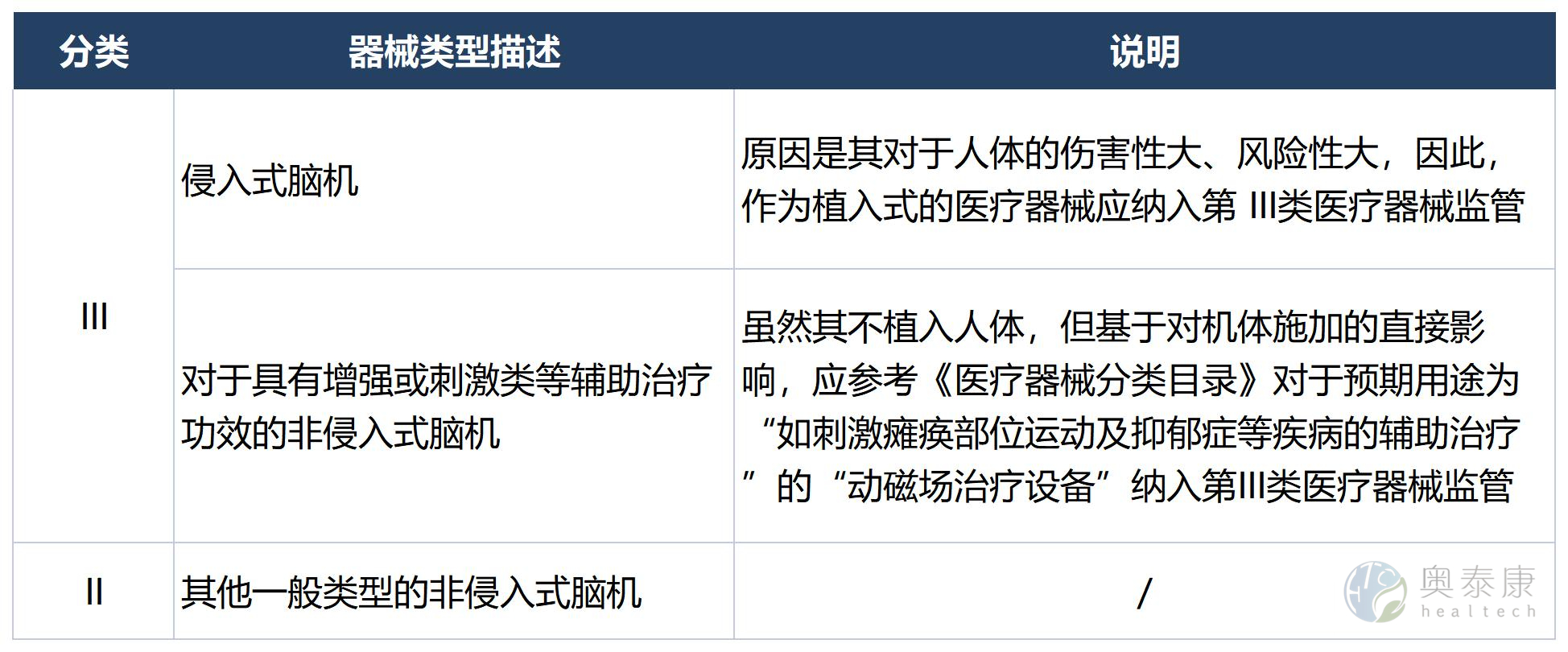 腦機(jī)接口技術(shù)需要大規(guī)模的臨床試驗和更加嚴(yán)謹(jǐn)?shù)囊?guī)范來推動其順利落地應(yīng)用,依據(jù)影響醫(yī)療器械風(fēng)險程度的因素、風(fēng)險程度高低兩類判斷標(biāo)準(zhǔn),目前,腦機(jī)接口臨床試驗規(guī)范還需要更加完善和細(xì)化,例如腦機(jī)接口臨床準(zhǔn)入細(xì)則、數(shù)據(jù)采集、處理、分析以及治療效果評估等等方面的指導(dǎo),以確保在腦機(jī)接口產(chǎn)品的開發(fā)和推廣過程中不會出現(xiàn)安全隱患。《醫(yī)療器械分類目錄》規(guī)定腦機(jī)接口設(shè)備的分類監(jiān)管要求如下: