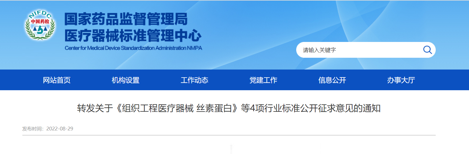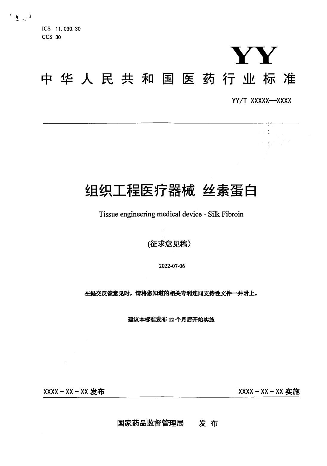 隨著絲素蛋白醫(yī)療器械產(chǎn)品的增加,對這一材料的生產(chǎn)制備、質(zhì)量控制等提出了要求。相對于產(chǎn)業(yè)的迅速發(fā)展,絲素蛋白相關(guān)標(biāo)準(zhǔn)在國際國內(nèi)仍處于空白。由于標(biāo)準(zhǔn)的缺乏,各絲素蛋白企業(yè)在企業(yè)標(biāo)準(zhǔn)制定過程中無統(tǒng)一的標(biāo)準(zhǔn)參考依據(jù),限制了絲素蛋白醫(yī)療產(chǎn)業(yè)的高質(zhì)量發(fā)展。目前,為提高絲素蛋白材料的質(zhì)量與安全性,為科學(xué)監(jiān)管提供支撐,由全國外科植入物和矯形器械標(biāo)準(zhǔn)化技術(shù)委員會組織工程醫(yī)療器械產(chǎn)品分技術(shù)委員會歸口的《組織工程醫(yī)療器械絲素蛋白》已形成征求意見稿[5],并于2022年8月23日-2022年10月24日期間公開征求意見。