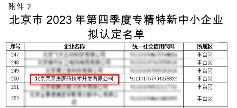 2024年1月30日,北京市經(jīng)濟和信息化局發(fā)布通知公告《關(guān)于對北京市2023年度第四季度專精特新中小企業(yè)名單進行公示的通知》,北京奧泰康醫(yī)藥技術(shù)開發(fā)有限公司成功被認定為北京市“專精特新”中小企業(yè),這也是奧泰康繼國家高新技術(shù)企業(yè)、中關(guān)村高新技術(shù)企業(yè)、全國科技型中小企業(yè)、北京市創(chuàng)新型中小企業(yè)之后,獲得的又一項重要資質(zhì)。
