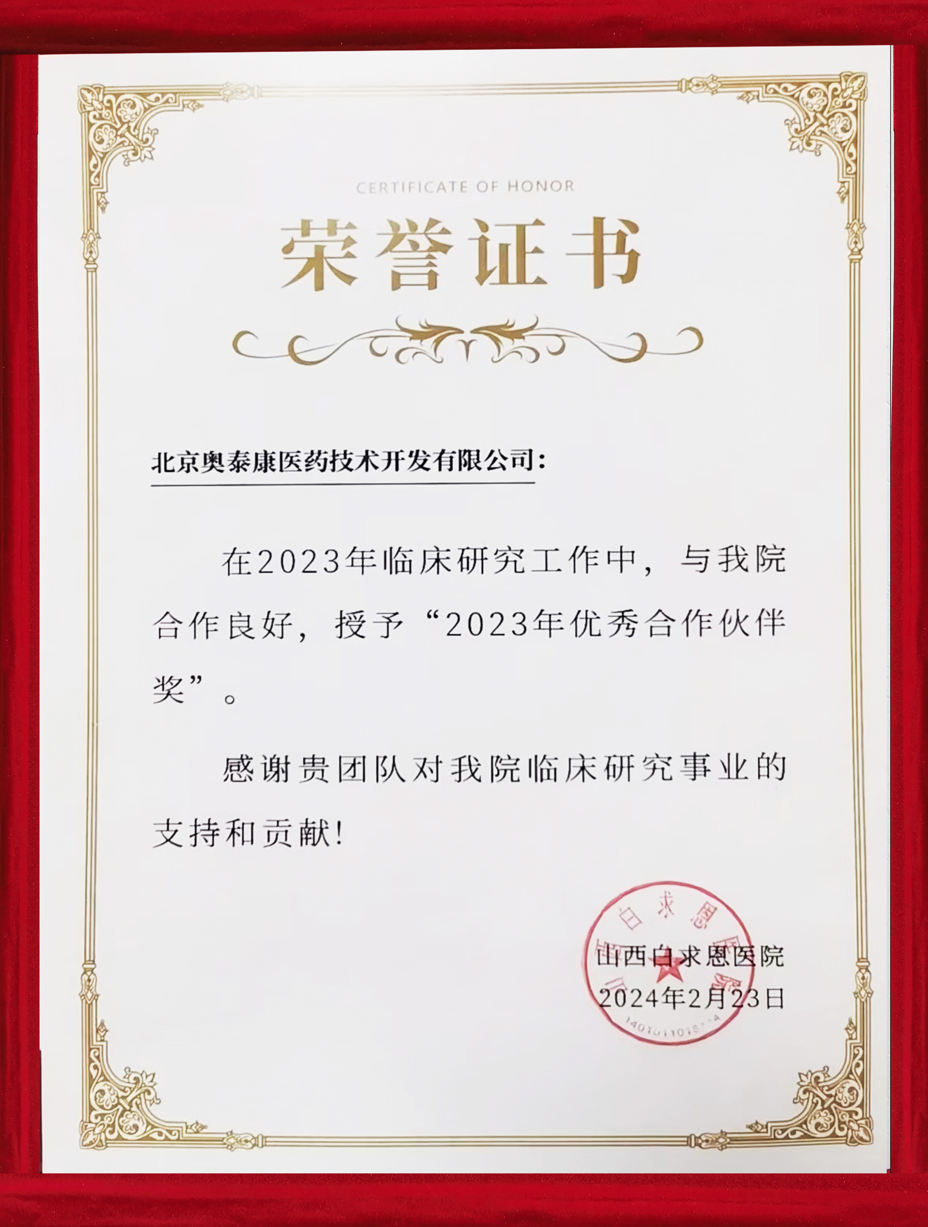 喜報(bào)~奧泰康榮獲山西白求恩醫(yī)院 同濟(jì)山西醫(yī)院“2023年優(yōu)秀合作伙伴獎”攜手前行,推進(jìn)臨床研究事業(yè)高質(zhì)量發(fā)展???前言