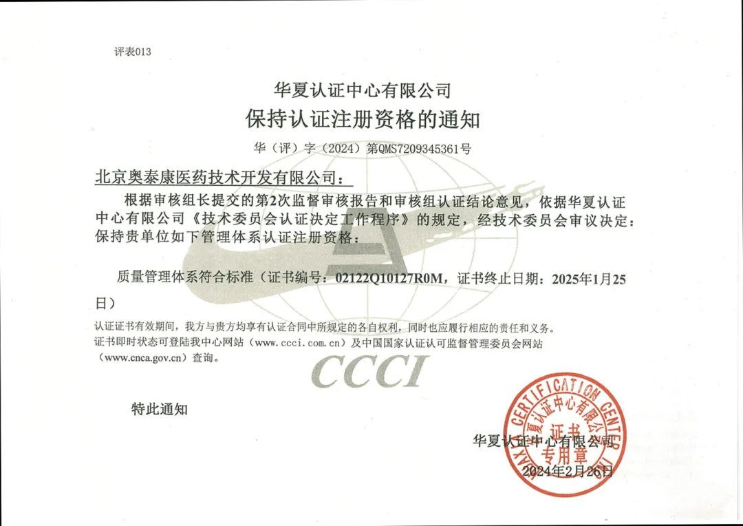 2024年3月,北京奧泰康醫(yī)藥技術(shù)開發(fā)有限公司經(jīng)華夏認證中心有限公司(CCCI)認證,順利通過ISO9001:2015 標準質(zhì)量管理體系認證年度審核,認證范圍為醫(yī)療器械臨床試驗及產(chǎn)品注冊服務(wù)。嚴格的質(zhì)量管理體系是企業(yè)持續(xù)、穩(wěn)定、健康發(fā)展的根本保證,通過ISO9001認證標志著我司的醫(yī)療器械臨床試驗及產(chǎn)品注冊服務(wù)與管理體系已達到了國際標準、行業(yè)標準,在制度化、體系化和標準化方面取得了里程碑式的進展。