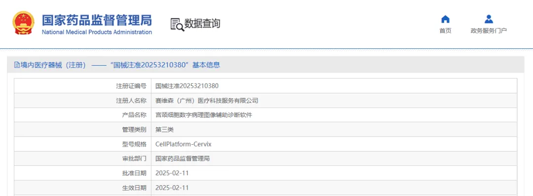 賽維森科技自主研發(fā)的“宮頸細(xì)胞數(shù)字病理圖像輔助診斷軟件”,正式獲得國家藥監(jiān)局(NMPA)頒發(fā)的第三類醫(yī)療器械注冊證,是宮頸細(xì)胞學(xué)領(lǐng)域首張“輔助診斷”三類證。人工智能正式升級為醫(yī)生的“超級助手”?。ㄗ宰C編號:國械注準(zhǔn)20253210380)