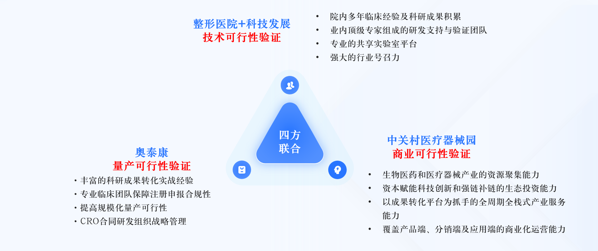 北京市整形醫(yī)學(xué)概念驗(yàn)證中心項目,由四家單位聯(lián)合申報實(shí)施。其中北京八大處整形科技發(fā)展有限公司聯(lián)合中國醫(yī)科院整形外科醫(yī)院完成技術(shù)可行性驗(yàn)證,北京奧泰康醫(yī)藥技術(shù)開發(fā)有限公司負(fù)責(zé)量產(chǎn)化驗(yàn)證,中關(guān)村醫(yī)療器械園有限公司完成商業(yè)化驗(yàn)證,四方相互協(xié)同,構(gòu)建“醫(yī)研產(chǎn)銷”一體化生態(tài)。
