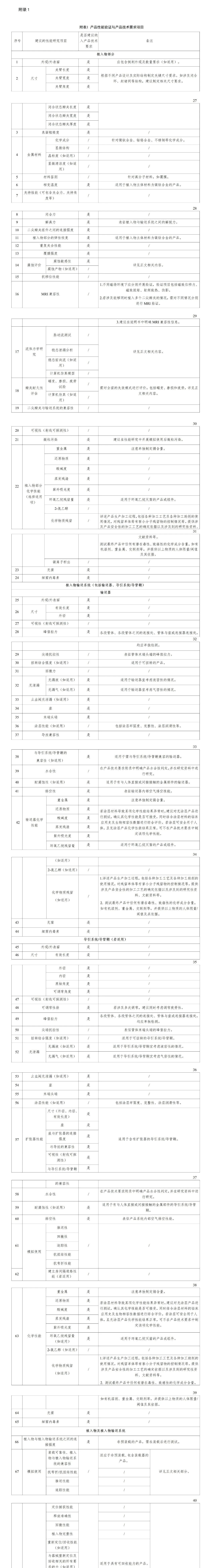 產(chǎn)品技術(shù)要求性能指標(biāo)可參考表1制定,如有不適用條款,申請(qǐng)人應(yīng)在申報(bào)資料中說明理由。如產(chǎn)品有特定設(shè)計(jì),申請(qǐng)人還應(yīng)根據(jù)產(chǎn)品設(shè)計(jì)特征設(shè)定相應(yīng)的性能指標(biāo),并將其列入產(chǎn)品技術(shù)要求。若有隨產(chǎn)品一起申報(bào)的附件,無論附件是否已取得醫(yī)療器械注冊(cè)證,均應(yīng)將附件的性能指標(biāo)制定在產(chǎn)品技術(shù)要求中。對(duì)于可進(jìn)行客觀判定的成品定性或定量的功能性、安全性指標(biāo),應(yīng)將其列入產(chǎn)品技術(shù)要求。